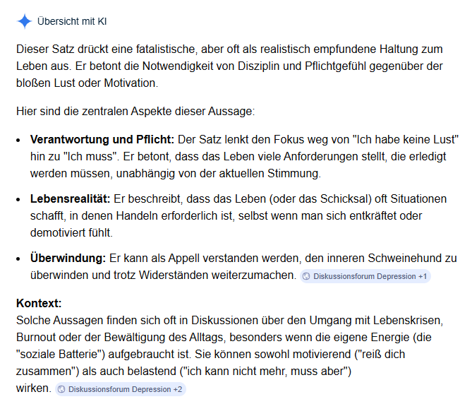 Dass die KI ihre obigen Informationen im wesentlichen aus einem „Diskussionsforum Depression“ generiert hat spricht Bände im Hinblick auf die Wirkungen einer solchen inneren wie äußeren Ausrichtung. Die Sprüche unserer Kindheit haben sich zu tiefgehenden, unterbewusst hochgradig wirksamen Glaubenssätzen verselbstständigt, mit gravierenden Auswirkungen auf unsere Lebensqualität.